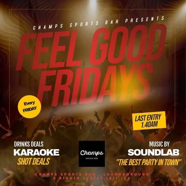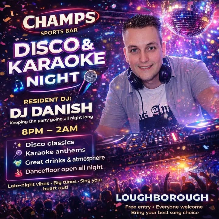 🎤✨ DISCO & KARAOKE NIGHT AT CHAMPS ✨🎤 Tonight’s the night! We’re turning up the volume with SoundLab Entertainment bringing the vibes from 8PM – 2AM 🔥 💃 Disco classics 🎶 Party anthems 🎤 Karaoke all night long 🍹 Drinks flowing 🔥 Big atmosphere Whether you’re grabbing the mic or owning the dancefloor, this is your time to shine 🌟 Round up your mates, warm up those vocal cords and let’s make it a big one at Champs 🎉 #ChampsLoughborough #KaraokeNight #DiscoVibes #SoundLabEntertainment #nightout