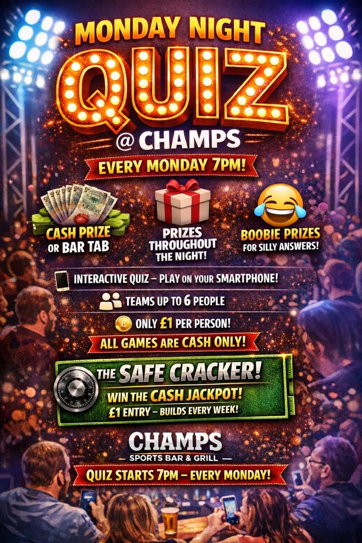 🔥 MONDAY NIGHT QUIZ @ CHAMPS 🔥 🧠 Think you’re the smartest team in town? Join us every Monday at 7PM for the Champs Quiz Night! 💰 Cash Prize or Bar Tab 🎁 Prizes Throughout the Night 😂 Boobie Prizes for the Most Ridiculous Answers 📱 Interactive Quiz – Play via Your Smartphone 👥 Teams of up to 6 people 💷 £1 per person to play (cash only) 🔐 PLUS… THE SAFE CRACKER 🔐 After the quiz, take your shot at cracking the safe and winning the CASH JACKPOT 💰 The jackpot builds every single week until someone wins! 🎟 £1 per entry (cash only)